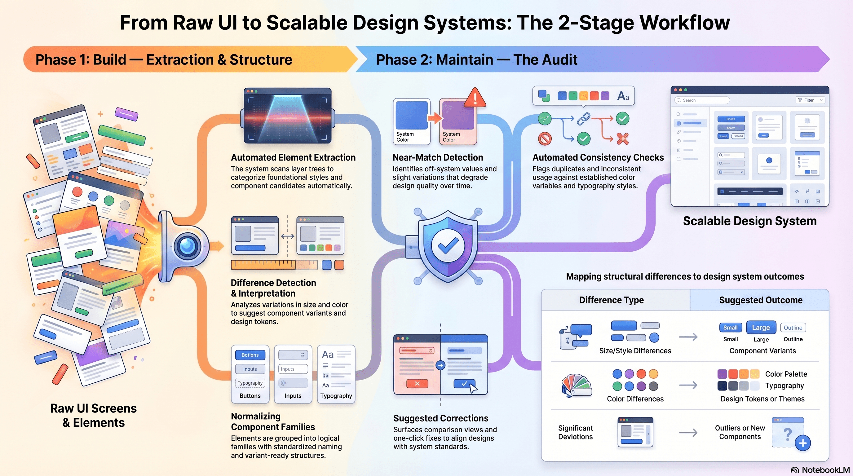 While this plugin is in progress, I used NLM to create this infographic to explain the full scope of work and outcome Using vibe coding (for instance, Figma Make) to create 0->1 designs for ideation and rapid prototyping is all fun and games until you need to turn that into a real design system that more serious vibe coding can turn into a real product 😅 Enter in this plugin ---> Extract, Structure and Audit your DS